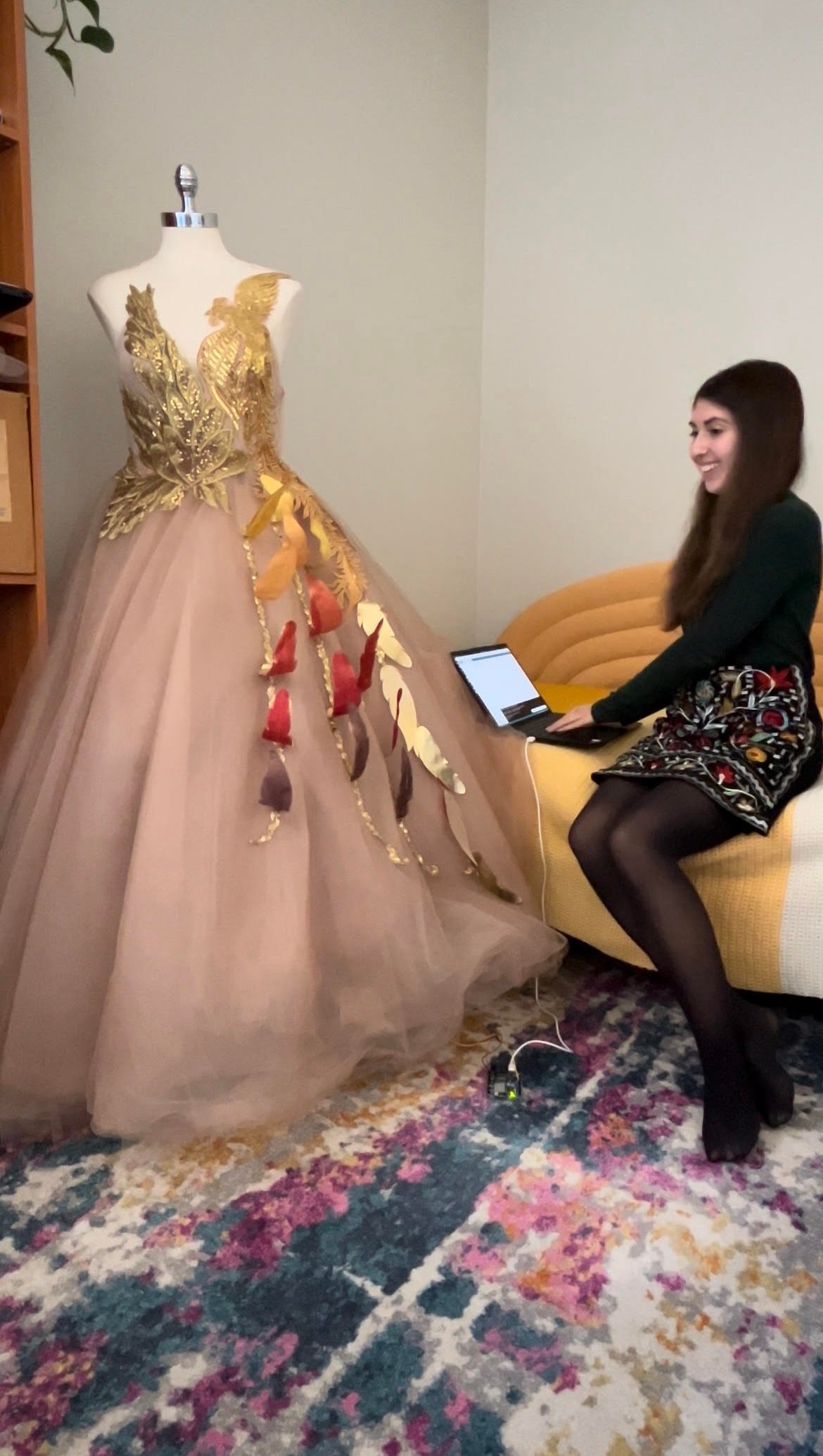 As a concrete example, we could talk through what I recently made for the Chicago Public Library. I was their maker in residence, which including making a window display for their State Street Library branch. I made a phoenix-inspired dress, with phoenix feathers that oscillate between the colors of the flames and gold to give the impression of burning. That's a nod to some Chicago history. I love starting with whimsy, fantasy-inspired designs because to me, that's what technology is. It's a vehicle for almost magic. A lot of my designs are inspired by “if we lived in a magical world, what would the villain or the wizard wear?”