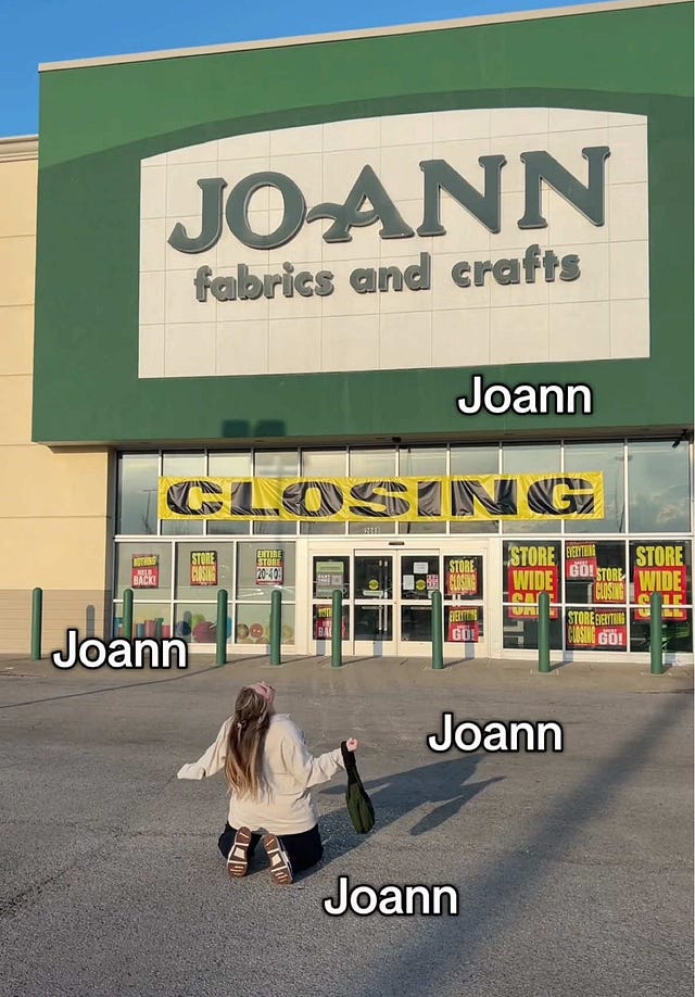 As for many sewists, some of my earliest memories of crafting involve going to JOANN Fabrics for the supplies to make the creations of my wildest dreams. Even if I’ve moved on to buying as many of my supplies secondhand as I can or from small businesses, the announcement of the craft chain’s closure still left me feeling a tinge of sadness. (See the TikTok remembrances in the Scrap pile below.) The move felt even more shocking given the steady revival of textile arts since the pandemic. Some have pointed to the role of private equity and economic factors in the store’s failure. I’d argue the main factor is its failure to meet the moment and understand its customer base. When I went to a JOANN store, I’d always wonder why copious displays of cheap, seasonal products and other goods that could only be classified as junk were given pride of place, while actual craft supplies seemed relegated to back corners. (I can’t find anyone who’s written on this point, but I thought this TikTok analysis was spot on.) Sure, a good deal could be found with the right coupon for sewing patterns or fabric. But the experience was completely unlike going to a local shop run by people who love nothing more than sharing their craft with others.
